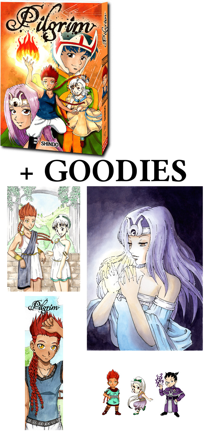 – Le manga Pilgrim. – Une carte postale format A6 (10 x 15 cm). – Un ex-libris format A5 (14,8 x 21 cm). – Un marque page. – Trois autocollants. Dessin dédicacé au nom de votre choix offert dans le volume. (Nom à indiquer en commentaire au moment de la commande.) Frais de port inclus. Livraison dans le monde entier.